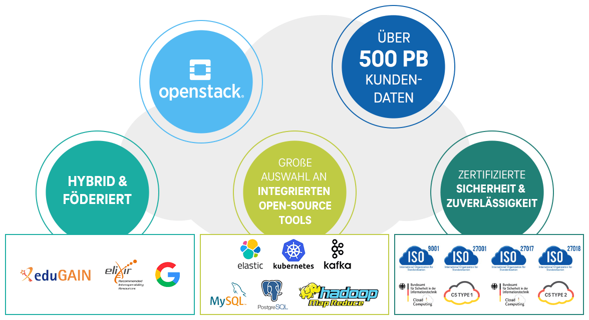 Die T Cloud Public basiert auf OpenStack, der am weitesten verbreiteten Open-Source Cloud Software. Unsere Mission ist es, die besten Open-Source Lösungen für alle benötigten Funktionen bereitzustellen, Anbieter Lock-Ins zu vermeiden und es den Nutzern zu ermöglichen, die Kontrolle über Programme und Daten zu jedem Zeitpunkt zurückzuerlangen. Zur Verwaltung von Gigabytes und Petabytes wissenschaftlicher Daten aus verschiedenen Speichern werden verteilte Datenmanagement- und Datenerhaltungsdienste zur Verfügung gestellt.