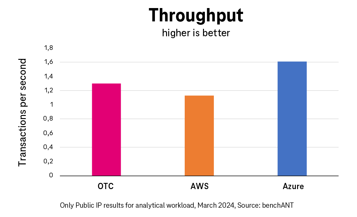 Im März 2024 evaluierte der unabhängige Benchmarker benchANT die PostgreSQL-Angebote von AWS, Azure und der T Cloud Public. benchANT erfasste die Latenzen und Durchsätze beim Einsatz der Datenbank für Analytik-Szenarios und als Home Location Register Datenbank. Die Szenarien wurden mithilfe von standardisierten Benchmarks (TPC-H und TATP) simuliert.