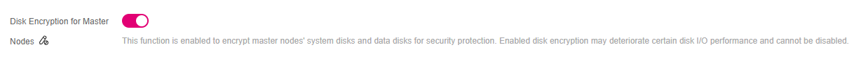 - Die Festplattenverschlüsselung für Master-Knoten ist eine neue Funktion von CCE. Sie ist jetzt in EU-DE und EU-NL verfügbar. Wenn Sie diese Option bei der Erstellung eines Clusters auswählen, können die System- und Datenfestplatten der Controller-(Master-)Knoten verschlüsselt werden, um einen wirksamen Schutz der Daten zu gewährleisten.