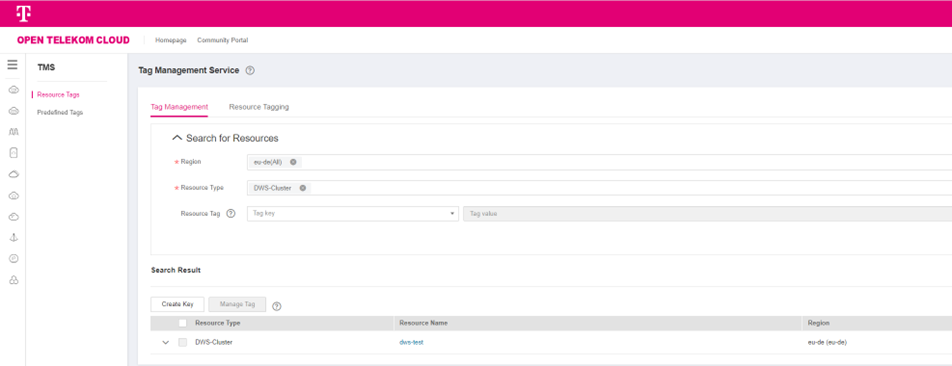Mit dem Tag Management Service (TMS) kann Data Warehouse Services (DWS) zentrale Tag-Verwaltung und Funktionen für die Klassifizierung von Ressourcen auf regionaler und Dienstebene bereitstellen. Sie können Schlagwörter anpassen, um Ressourcen zu klassifizieren und zu lokalisieren.