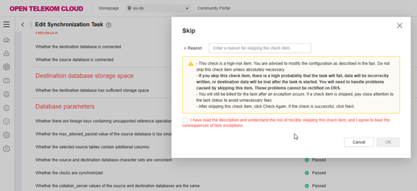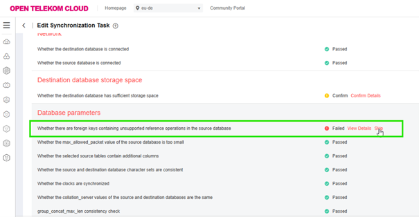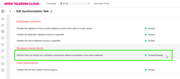 DRS unterstützt während der Vorkontrolle, dass das Element “Whether there are foreign keys containing unsupported reference operations in the source database” wie folgt übersprungen werden kann: