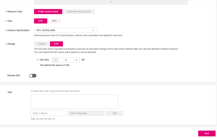 Dies ist ein Beispiel wie „Tags“ in ModelArts bei der Erstellung von Jupyter Notebooks genutzt werden können: