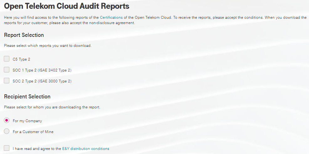 The audit reports (SOC, C5) of T Cloud Public are now available through a user-friendly self-service portal in myWorkplace. This allows you to access the necessary reports directly and efficiently.
