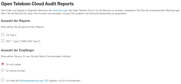 We are pleased to inform you that the audit reports (SOC, C5) of T Cloud Public can now be downloaded via a user-friendly self-service portal within myWorkplace.
